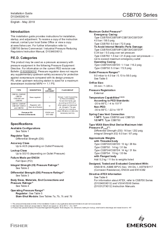 Type CSB700/CSB720: 1.1 bar / 16.2 psig