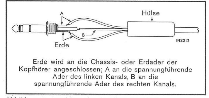 Die Kopfhörerbuchse eignet sich zur Aufnahme aller normalen Stereo-Kopfhörerstecker (USA-Typ). Wenn Ihre Stereo-Kopfhörer nicht mit einem Stecker ausgerüstet sind, muss ein Stecker nach Abbildung 3 angeschlossen werden. Wenn Ihre Kopfhörer bereits einen Stecker besitzen, hören Sie einer sinfonischen Aufnahme zu. Wenn die Violinen auf der rechten Seite zu hören sind, müssen Sie die Kopfhörer anders herum aufsetzen.