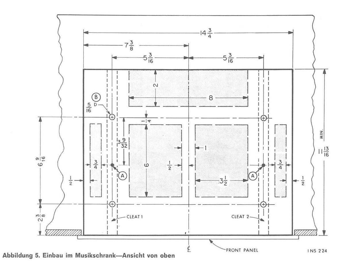 Zum Versand des Geräts werden vier Kunststoffsockel an die Unterseite des Chassis angeschraubt. Diese Sockel müssen zuerst abgenommen werden, ehe der Einbau in einen Musikschrank erfolgt.