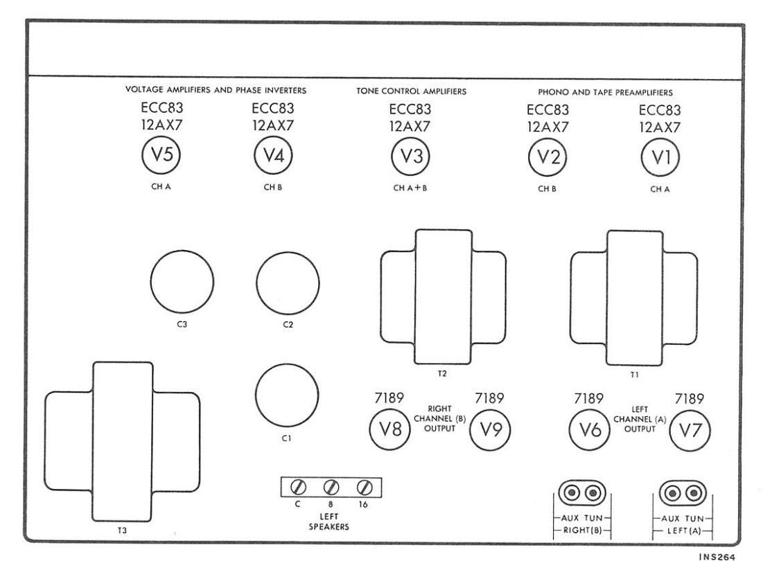 Bei offener Aufstellung mit oder ohne Gehäuse Modell 50-U ist auf allen drei Seiten des Geräts ein Abstand von mindestens 5 cm einzuhalten, sowie 10 cm Abstand über den Endröhren (V6 bis V9), damit für hinreichende Lüftung gesorgt ist. Ausserdem darf das Gerät nicht auf weiches oder nachgiebiges Material gestellt werden, weil das u.U. die Lüftung beeinträchtigen würde. Eine zweite Methode besteht darin, den Verstärker in ein Spezialgehäuse oder einen Musikschrank einzubauen. Ein solcher Einbau setzt jedoch voraus, dass der Lüftung besondere Beachtung geschenkt wird. Bitte schlagen Sie den Abschnitt Einbau in diesem Handbuch nach, ehe Sie irgendeine andere Aufstellungsart in Angriff nehmen als die oben beschriebene "offene" Aufstellung.