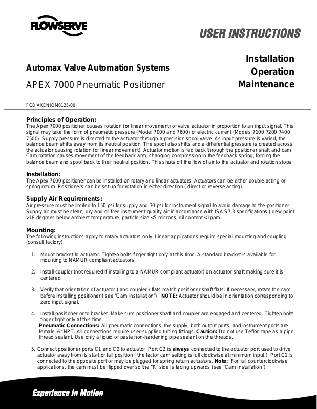The Apex 7000 positioner causes rotation (or linear movement) of valve actuator in proportion to an input signal. This