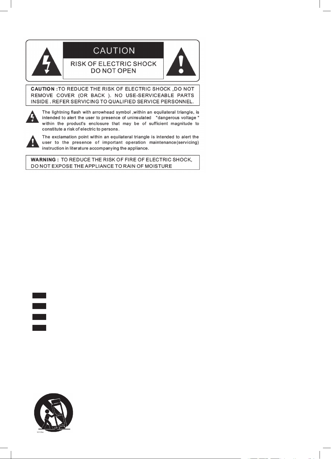Use only with the cart, stand, tripod, bracket, or table specied by the manufacturer, or sold with the apparatus. When a cart is used, use caution when 21.