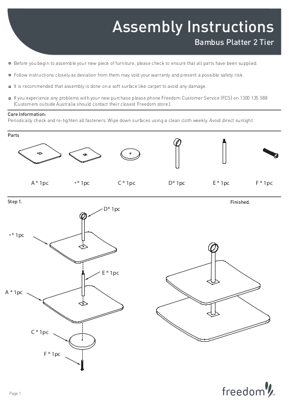 If you experience any problems with your new purchase please phone Freedom Customer Service (FCS) on 1300 135 588