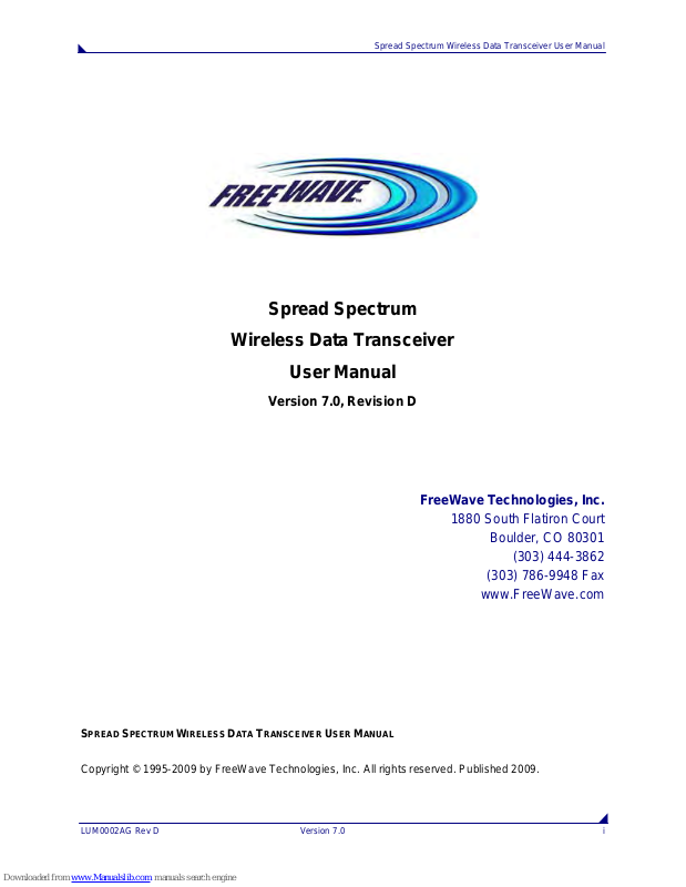 This manual is for use by purchasers and other authorized users of the FreeWave® Wireless Data