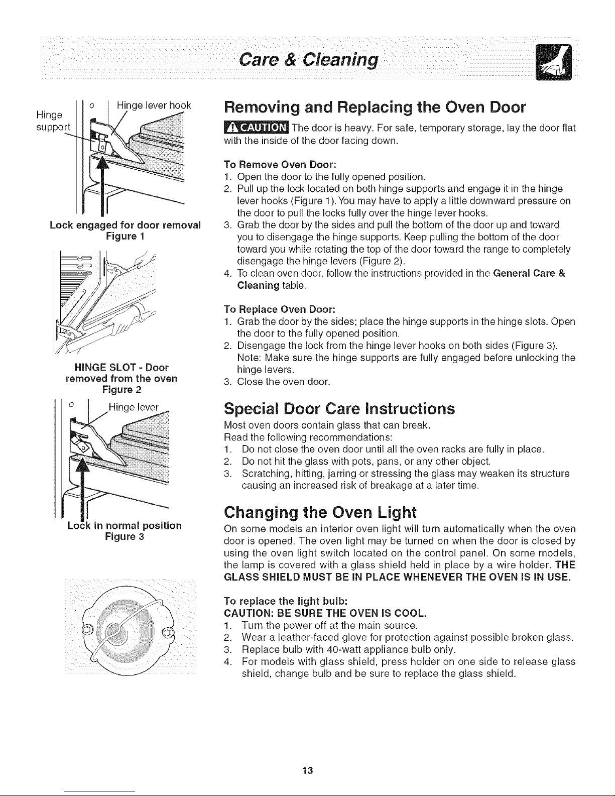 Oven light does not work. Burned-out or loose bulb. Follow the instructions under Changing Oven Light to replace