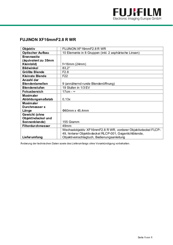 Wechselobjektiv XF16mmF2.8 R WR, vorderer Objektivdeckel FLCP-