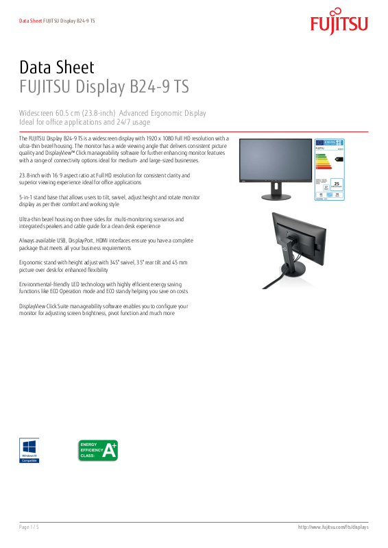 The FUJITSU Display B24-9 TS is a widescreen display with 1920 x 1080 Full HD resolution with a
