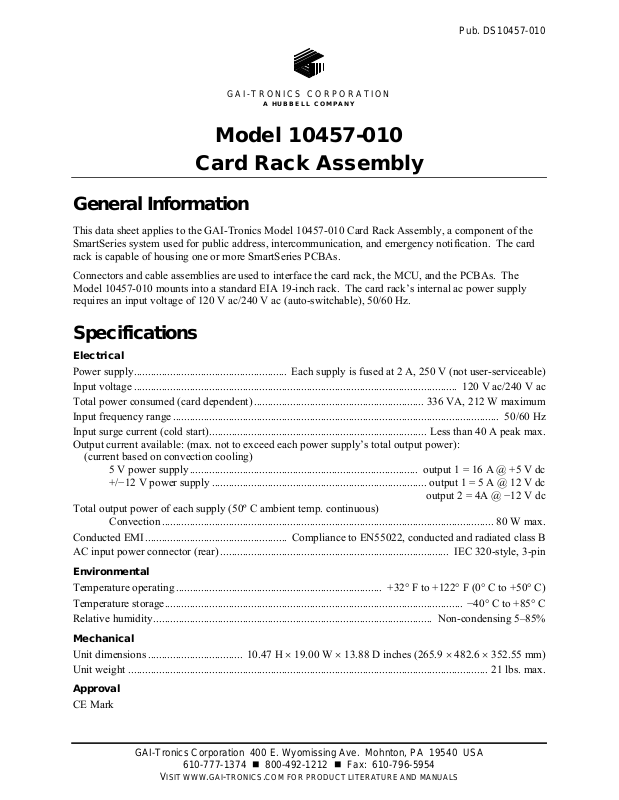 This data sheet applies to the GAI-Tronics Model 10457-010 Card Rack Assembly, a component of the