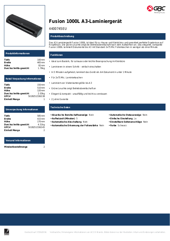 Gedruckt auf 27/06/2016 Vertrauliche, firmeneigene Informationen von ACCO Brands. Bilder dienen nur der Illustration. Irrtum und Änderungen vorbehalten.
