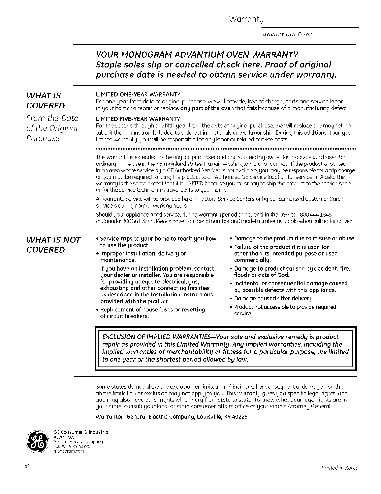 Warrantor: General Electric Company, Louisville, KY40225