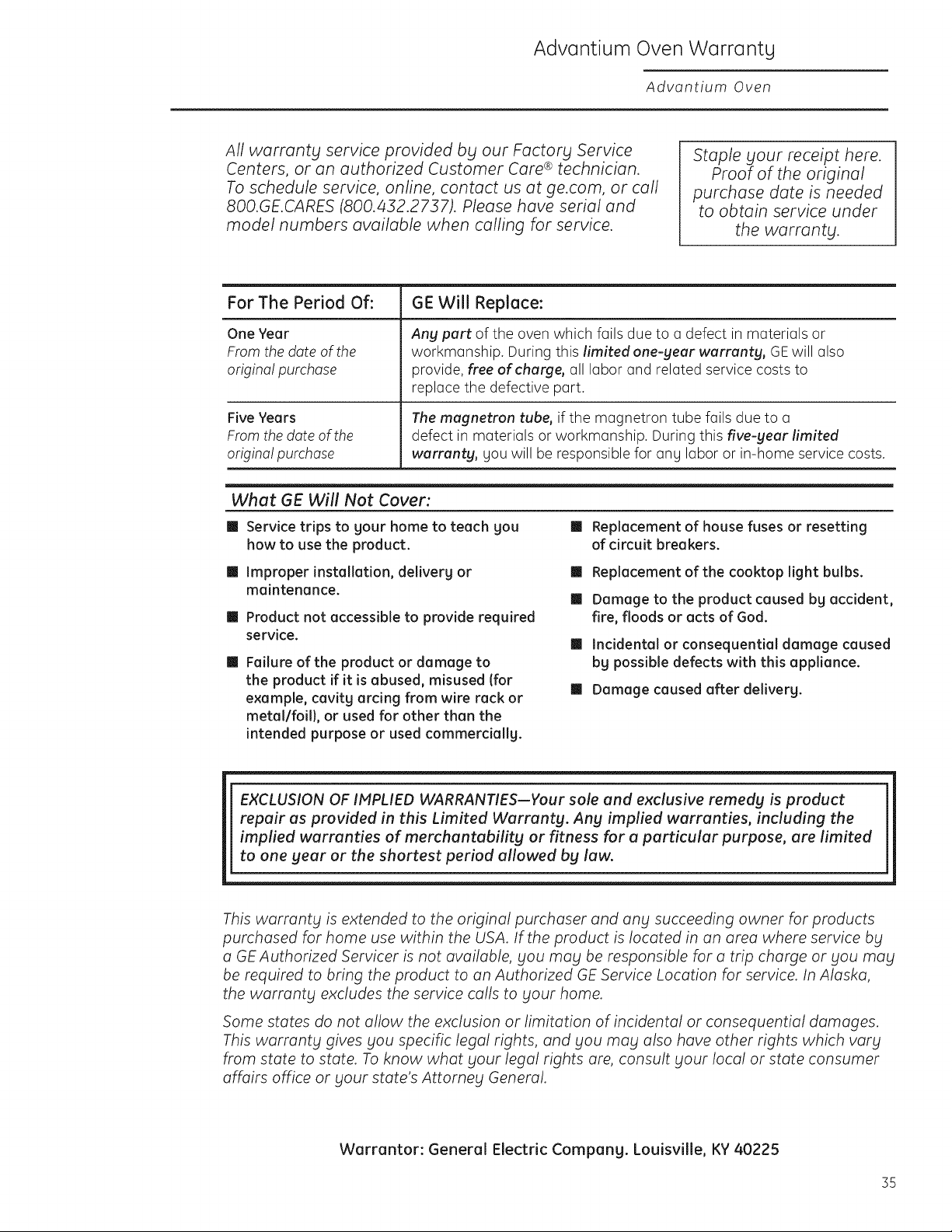 Warrantor: General Electric Compang. Louisville, KY 40225