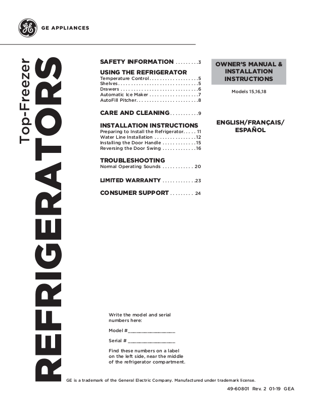 General Electric GTS16GTHBB, HPE15BTHWW, GIE18ETHBB, GTE18ISHSS, GTS16DTHBB, GPE16DTHCC, GTE18ETHBB Owners Manual