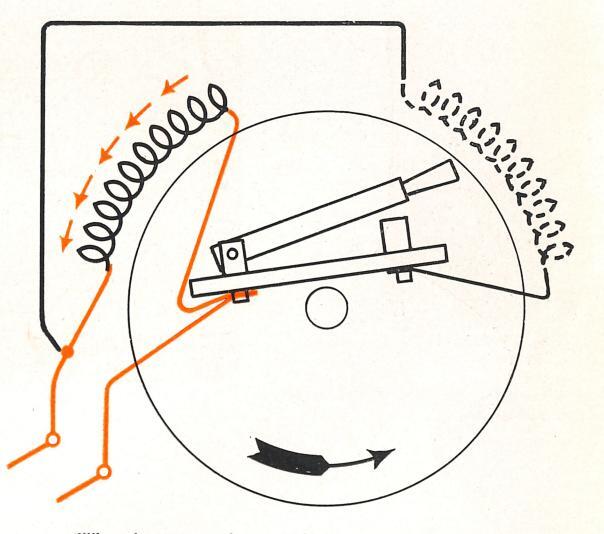 The arrangement and operation of these parts are shown below. The windings are located in different sectors around the stator, and the starting winding is in series with the starting switch. A switch-actuating mechanism is mounted on the rotor and is set to open the switch and open-circuit the starting winding when the motor reaches a predetermined speed.