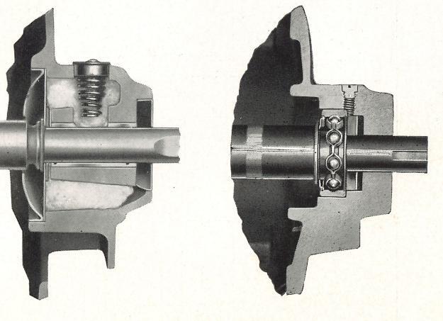 This sleeve bearing, equipped with a convenient oiler has extra-large oil-storage capacity and requires oiling only at infrequent intervals. Oil is filtered and fed to the bearing surfaces by the wool packing and is circulated by oil throwers and returns. The mirror-like finish of the linings adds to bearing life and makes for quiet operation. Ball bearings can be furnished if desired. They are packed at the factory with sufficient grease to last approximately two years of normal service.