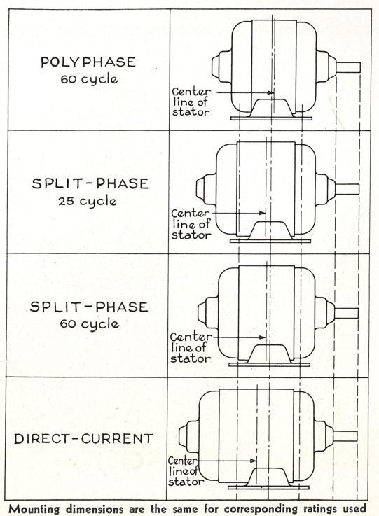 ing ratings for other power supplies can be mounted by using the same bolt holes. The location of the base holes, and of the shaft location with respect to the base holes, are the same for all these motors. Motors with solid bases are also interchangeable, with respect to mounting, with resilient-base motors. Identical mounting dimensions are a valuable feature of G-E motors. They save money on installation costs when machines are to be used on different power supplies.