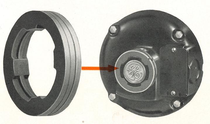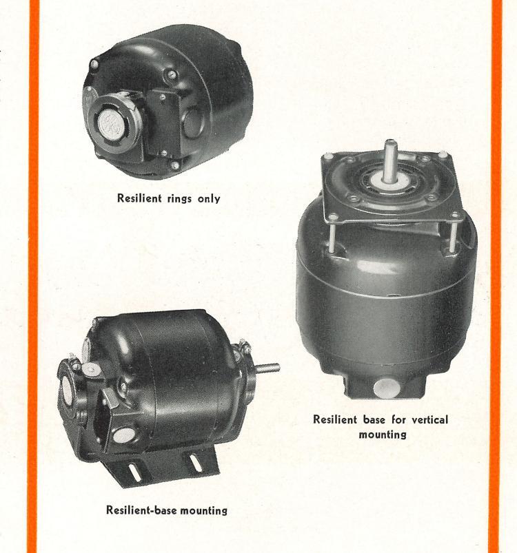 Where quiet operation is desirable, the scientifically designed General Electric resilient mounting. available in all split-phase-motor frame sizes, should be used. Large rings of resilient material. close to the axis of vibration, are the cushioning elements. Careful selection of materials and accurate calculation of dimensions give these rings the proper characteristics to absorb torque pulsations, restrain endwise movements, and maintain shaft alignment. The improved resilient material now used in these rings is practically impervious to oil, moisture, and aging These resisting qualities are inherent in the material and are not the result of surface treatment of the rings. General Electric resilient mounting will remain unchanged throughout the life of the motor.