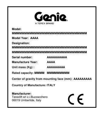 На идентификационной табличке отштампованы: модель, наименование, серийный номер, масса, грузоподъёмность и год выпуска навесного оборудования.