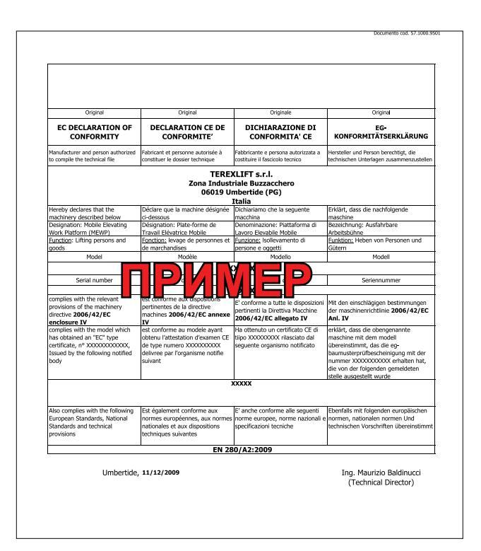 Соответствует всем нормативам Машинной Директивы 2006/42/ЕС Приложение IV