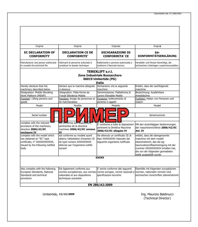 Соответствует всем нормативам Машинной Директивы 2006/42/ЕС Приложение IV