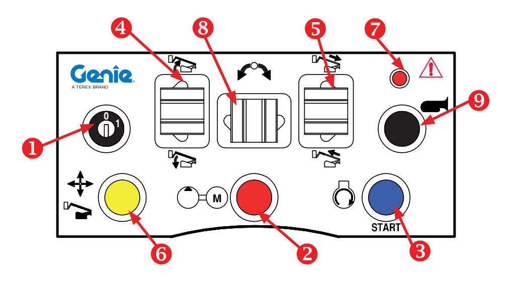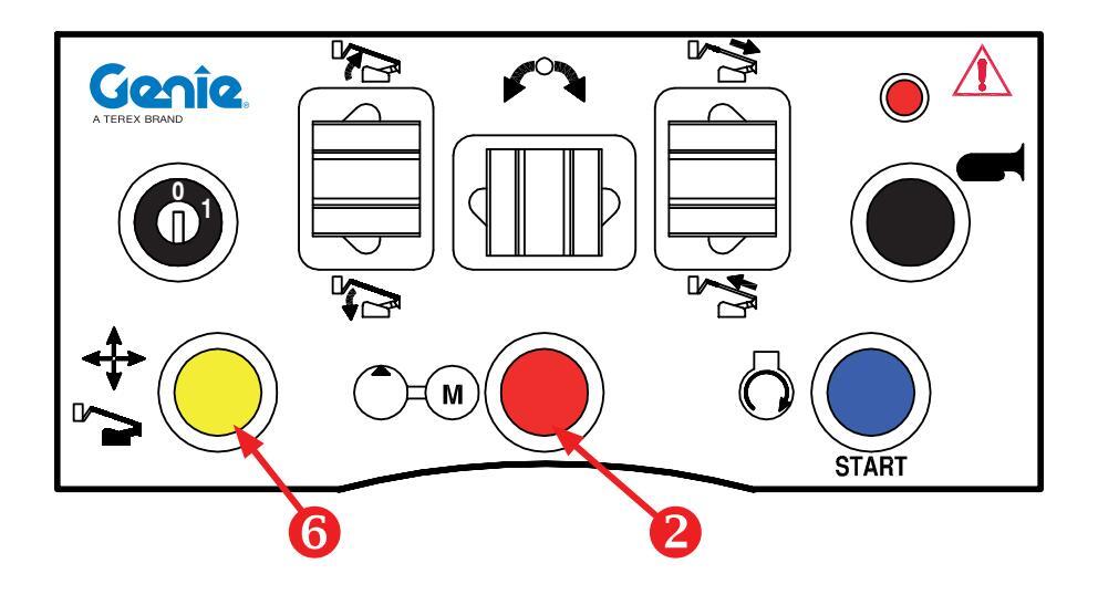 Jį nuspaudus, mašinos variklis išsijungia ir visi darbinės platformos judesiai sustabdomi. Prieš vėl pradėdami darbą, suraskite ir pašalinkite priežastis, kurios lėmė avarinį sustojimą, o po to iš naujo nustatykite mygtuką į neutralią padėtį, nuspausdami jį žemyn ir kartu sukdami pagal laikrodžio rodyklę. Siekdami patikrinti jo veikimą: