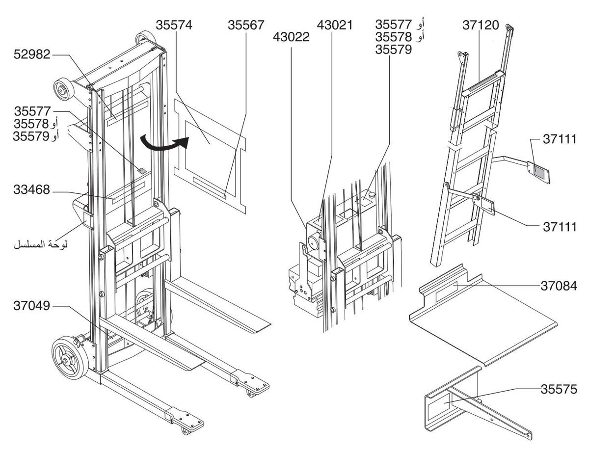 لا تضع سلالم أو سقالات على أي جانب من الآلة. لا تقم بتشغيل الآلة في حالة عدم تثبيت إعدادات الكاستر / الساق/ العجلة بشكل صحيح. يقيل الاستخدام، تحقق من منطقة العمل للتأكد من عدم وجود انحدار ات أو حفر أو مخلفات أو أسطح غير ثابتة أو زلقة أو أي أوضاع خطرة ممكنة أخرى.