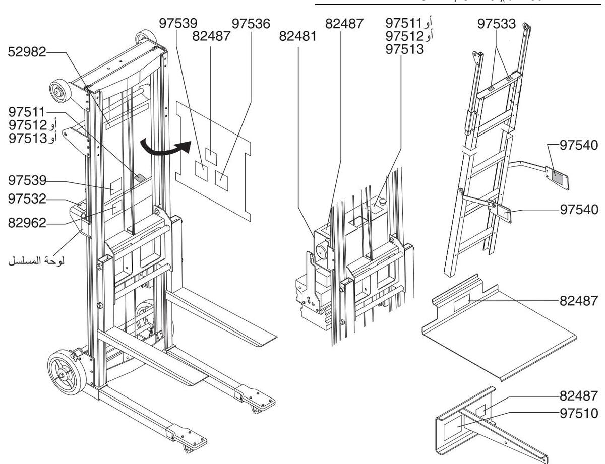 تأكد من أن جميع الملصقات في مكانها ومقروءة. ضع شحمًا مناسبًا على الونش. انظر دليل خدمة وأجزاء Genie Lift للحصول على التفاصيل. لا تضع زينًا أو شحمًا على أسطح الفرامل.