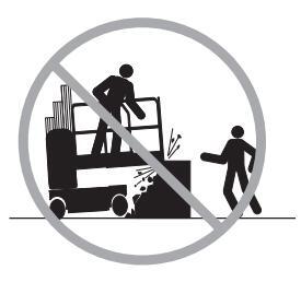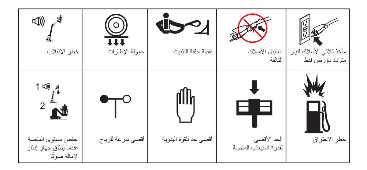 لا تضع أو ترفق حمولات متدلية بأي جزء من الآلة. لا تضع سلالم أو سقالات من الآلة. من الآلة. لا تنقل الأدوات والمواد من الآلة. لا تستخدم الألد على متوازن للموجود في المنصة أن يتعامل معها بأمان. أو مركبة متحركة أو متنقلة. لا تستخدم الآلة على سطح أو مركبة متحركة أو متنقلة. لا عجلات مربوطة في حالة جيدة وأن صواميل بشكل صحيح.