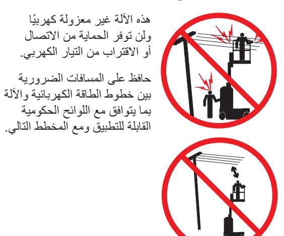 ابق بعيدًا عن الألة إذا اتصلت بخطوط طاقة موصلة بالتيار الكهربي. يتعين على أفراد العمل الموجودين على الأرض أو في المنصة عدم لمس الآلة أو تشغيلها إلا بعد إيقاف تشغيل خطوط الطاقة الكهربائية.