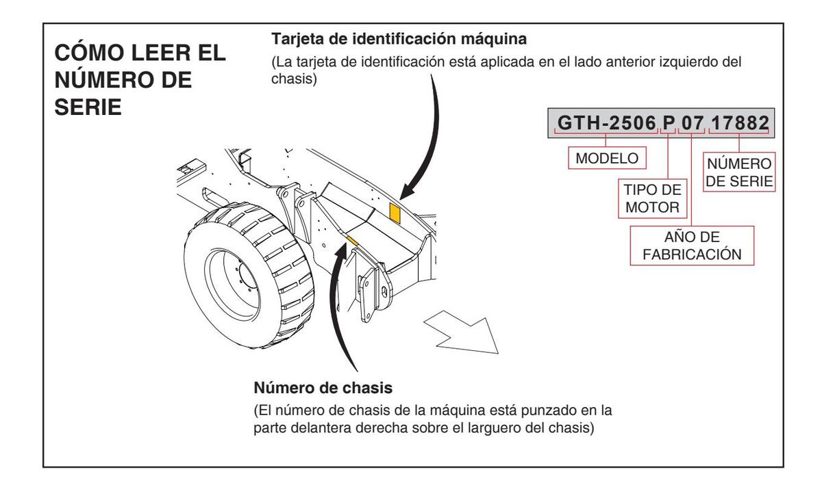 El número de chasis de la máquina está punzado en la parte delantera derecha sobre el larguero del chasis.