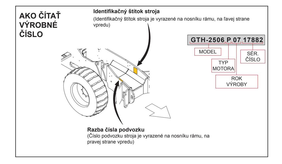 Na identifikačnom štítku, ktorý je pripevnený na prednej ľavej strane vpredu, sa uvádzajú základné identifikačné údaje stroja, medzi ktorými model, výrobné číslo a rok výroby.