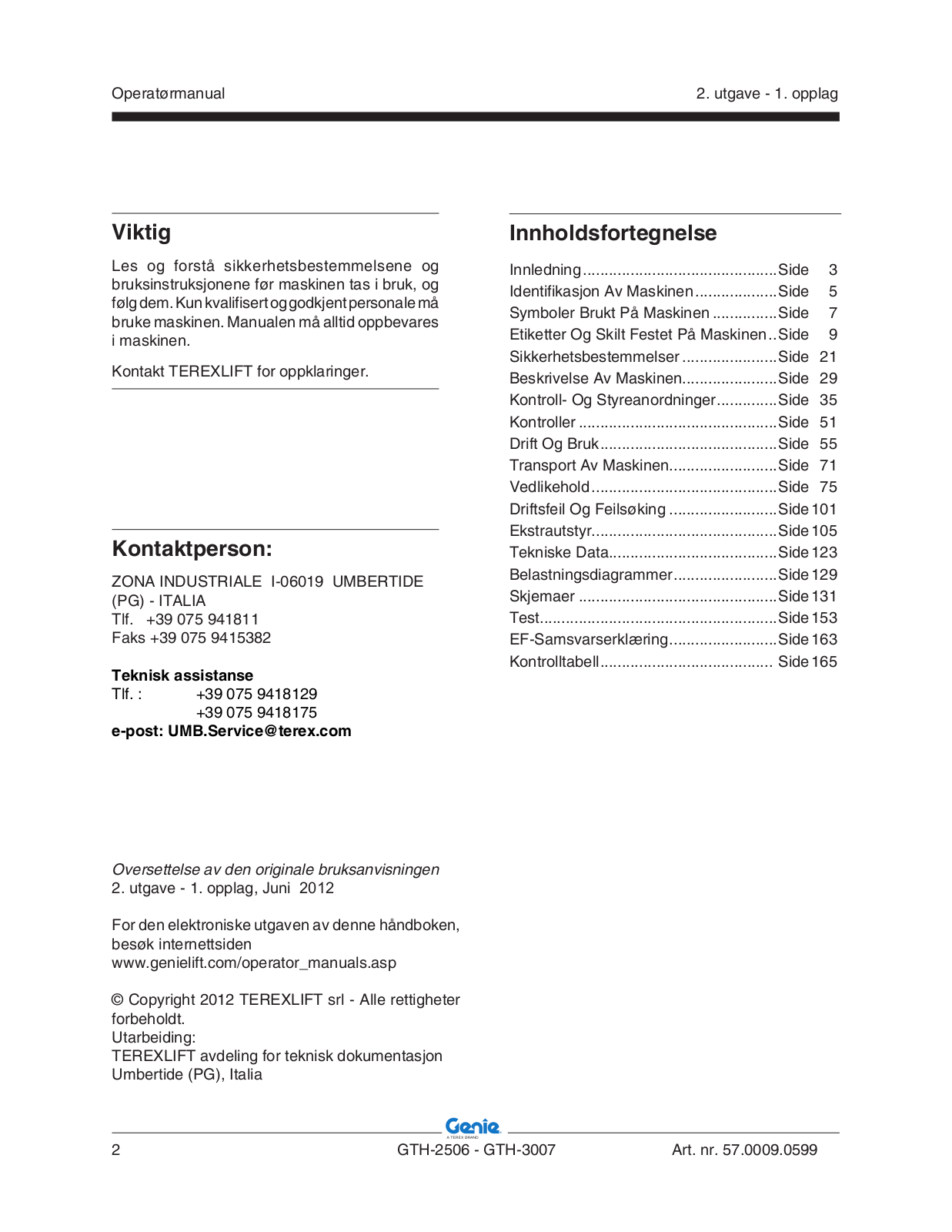 © Copyright 2012 TEREXLIFT srl - Alle rettigheter forbeholdt. Utarbeiding: TEREXLIFT avdeling for teknisk dokumentasjon Umbertide (PG), Italia