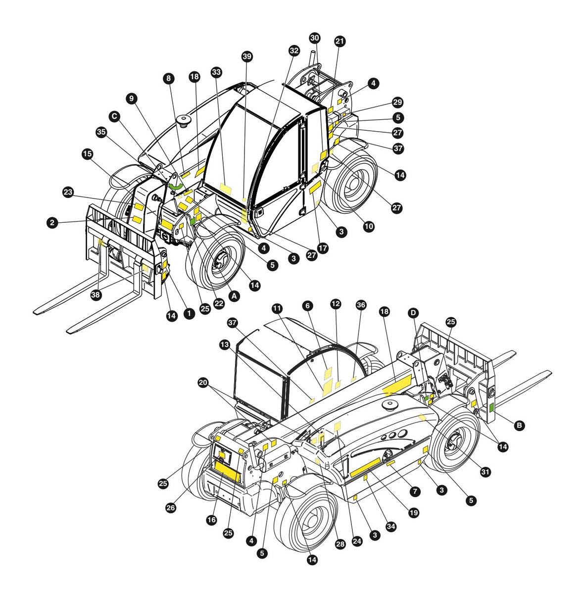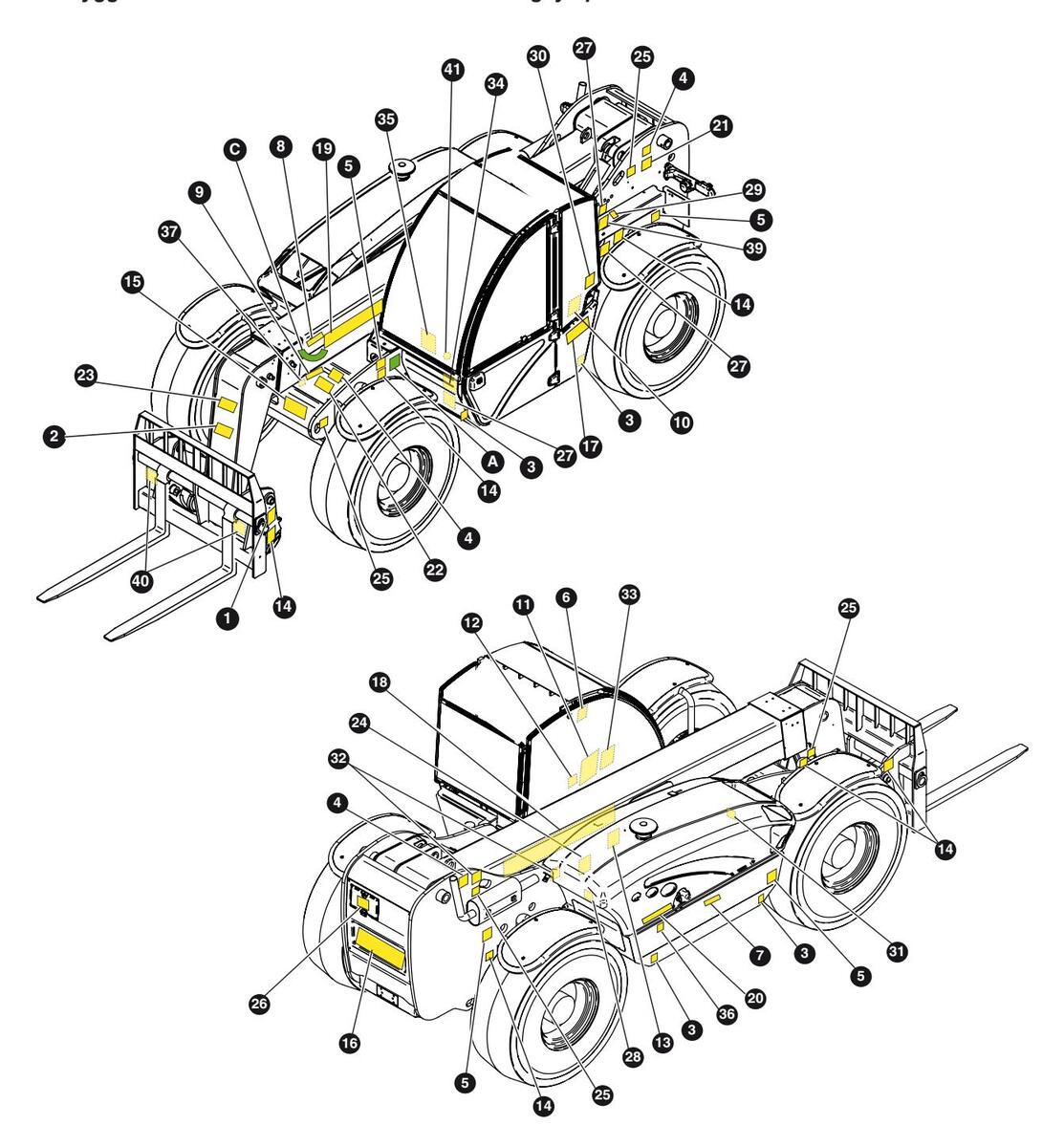 Plötur helstu hluta lyftarans sem ekki eru beinlínis framleiddir af TEREXLIFT srl (til dæmis vélar, dælur o.s.frv.) eru staðsettar þar sem þeim var komið fyrir af framleiðendum beirra.