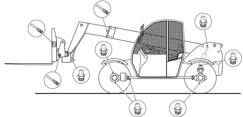 Fyllið á lyftarann með eftirfarandi smurefnum: