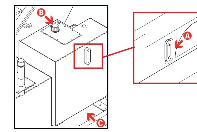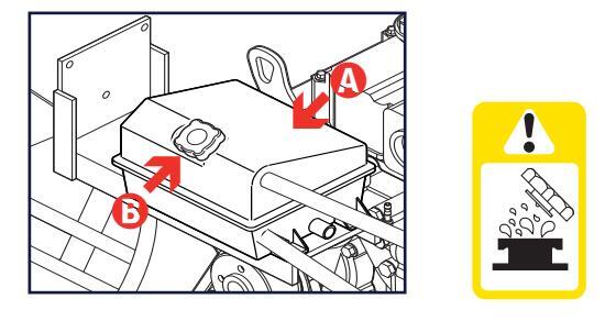 V prípade potreby doplňte olej cez napĺňací uzáver B.
