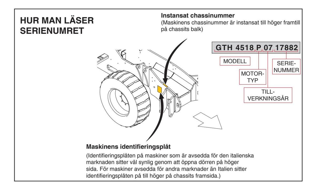 Identifieringsplåten på maskiner som är avsedda för den italienska marknaden sitter väl synlig genom att öppna dörren på höger sida. För maskiner avsedda för andra marknader än Italien sitter identifieringsplåten på till höger på chassits framsida.
