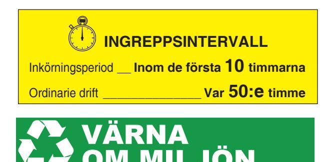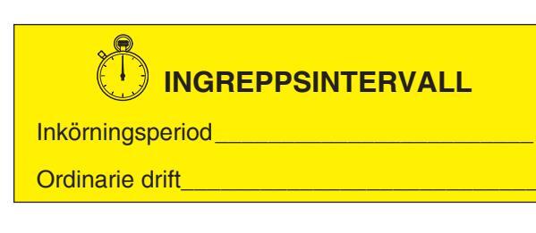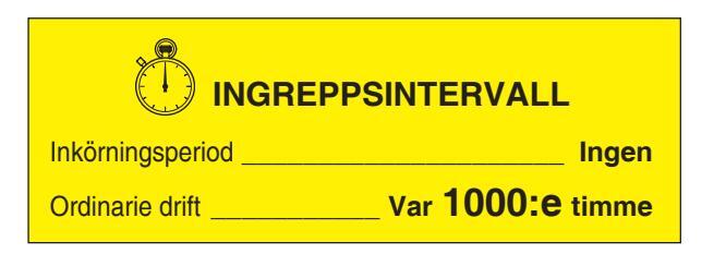 Underhållsintervallen fastställs i förhållande till de arbetstimmar som maskinen utfört. Kontrollera timmätaren och håll den funktionsduglig för att kunna fastställa underhållsintervallen korrekt. Säkerställ att alla fel som upptäckts under underhållsarbetet åtgärdats innan maskinen tas i bruk på nytt.