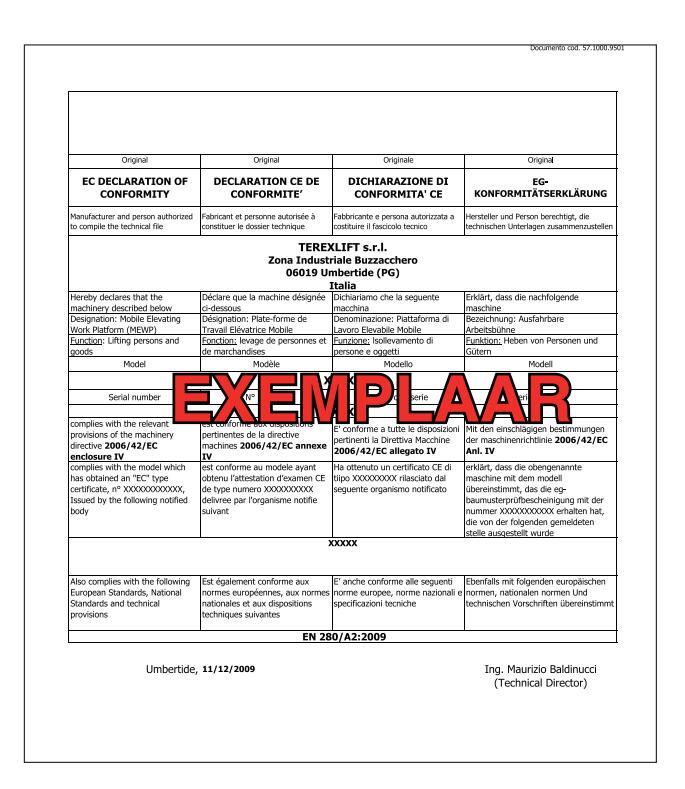 Bouwer en bevoegde persoon voor het samenstellen van het technische dossier TEREXLIFT s.r.l. Zona Industriale Buzzacchero 06019 Umbertide (PG) Italia We verklaren dat het volgende toestel Benaming: Mobiel Hoogwerkplatform Werking: heffen van personen en voorwerpen Model XXXXX Serienummer XXXXX Voldoet aan alle bepalingen van de Machinerichtlijn 2006/42/EG, bijlage IV Het volgende EG-conformiteitscertificaat type XXXXXXXX heeft verkregen, afgegeven door de volgende aangemelde instantie: XXXXX Voldoet tevens aan de Europese en nationale normen en technische specificaties: EN 280/A2:2009