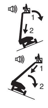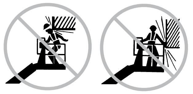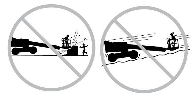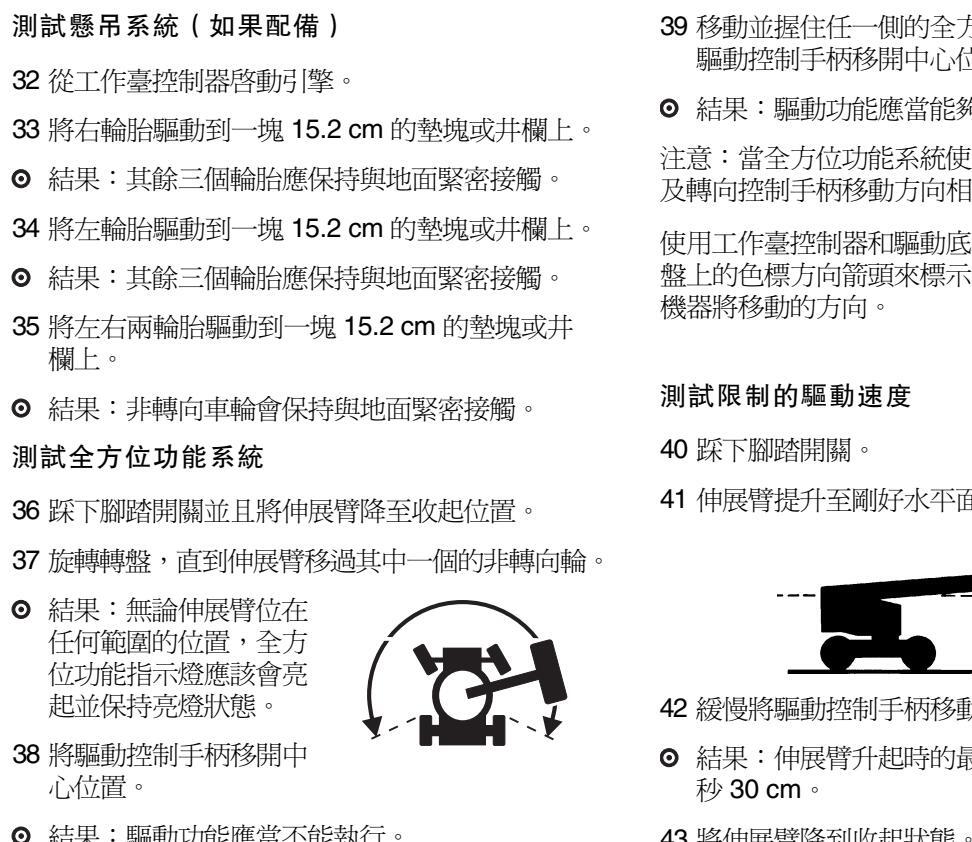 請勿在水平面以上延伸、旋轉及升起伸展臂。工作臺 升起之前,請把機器移到堅固、水平的地面上。如果 提升工作臺時發出傾斜警示鈴聲,要十分小心地收回 伸展臂並降下工作臺。請勿在降下的過程中旋轉伸展 臂。工作臺升起之前,請把機器移到堅固、水平的地 面上。