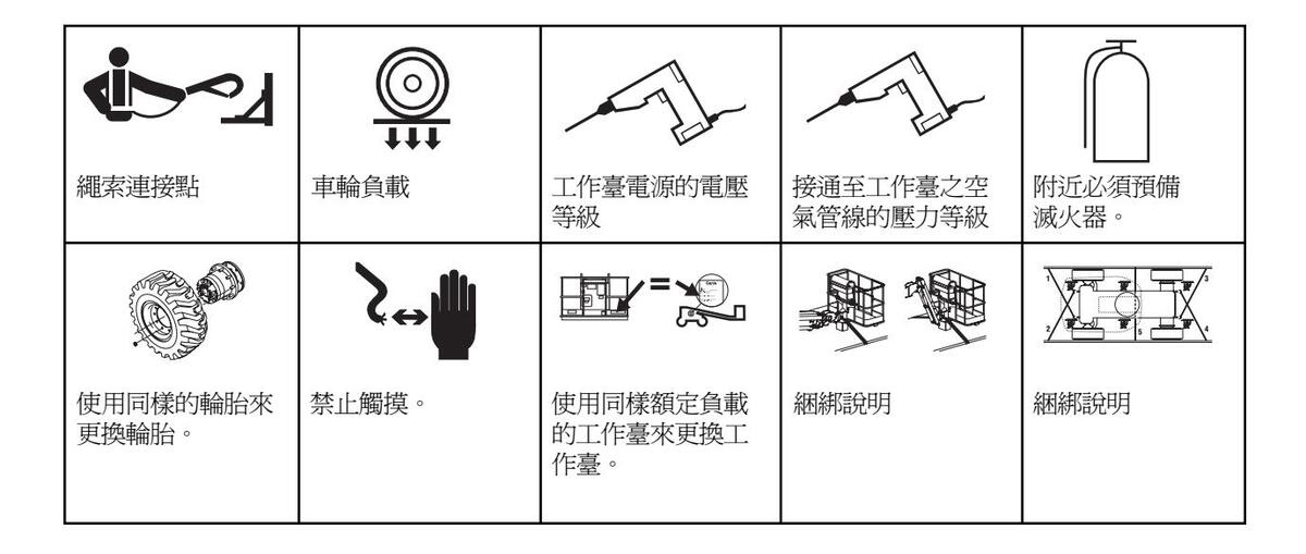 操作此機器時需要穿戴個人墜落防護裝備 (PFPE)。 工作臺上的人員必須依照政府規章佩帶安全帶或安全