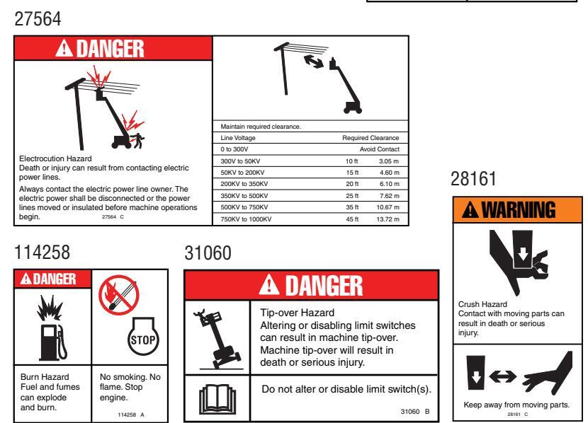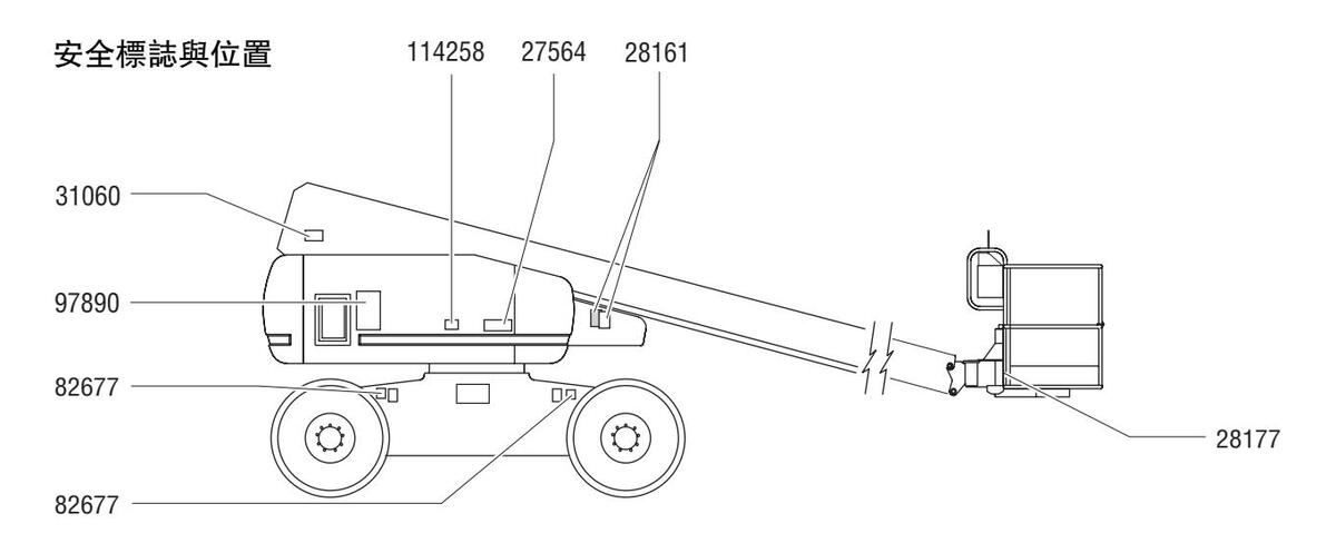 更換任何遺失或損壞的安全標誌。隨時注意操作人 員的安全。使用中性肥皂和清水來清潔安全標誌。 請勿使用溶劑型的清潔劑,因爲它們會損壞安全標 誌的材料。