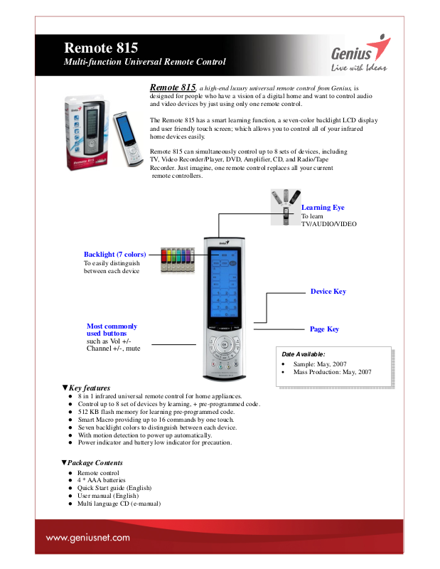 The Remote 815 has a smart learning function, a seven-color backlight LCD display