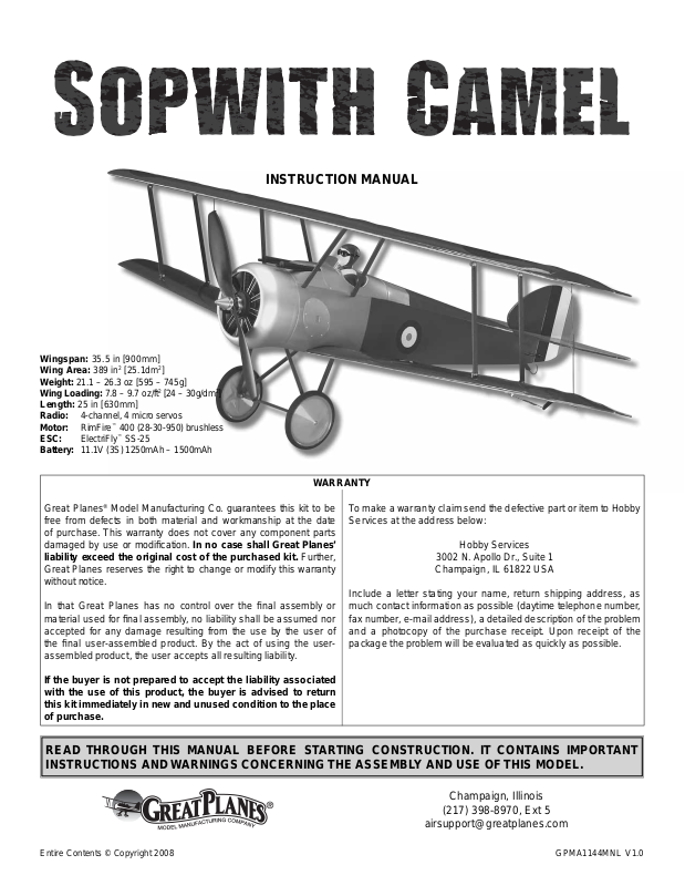 Thank you for purchasing the Great Planes EP Sopwith