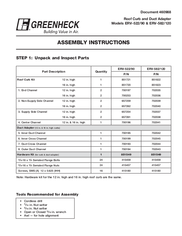Note: Hardware kit for the 12 in. high and 16 in. high roof curb are the same.