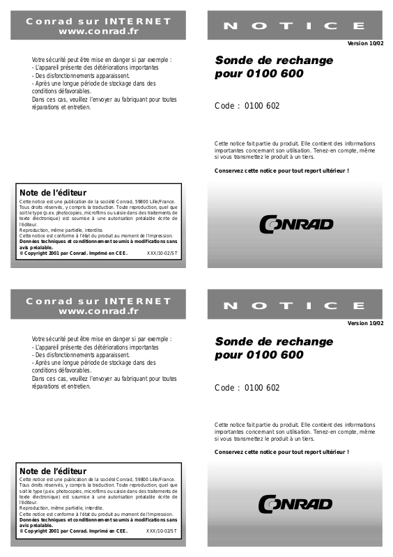 Directives européennes :Cette sonde est conforme aux consignes essentielles de