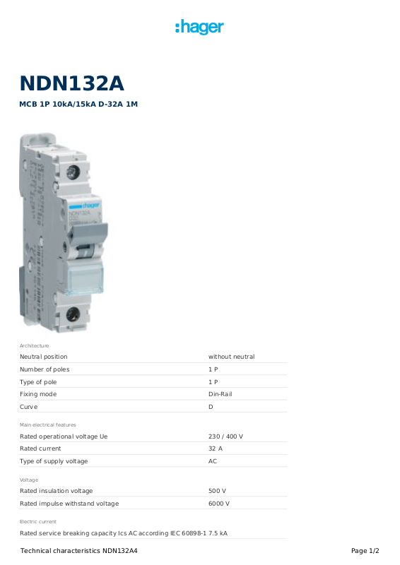 Rated service breaking capacity Ics AC according IEC 60898-1 7.5 kA