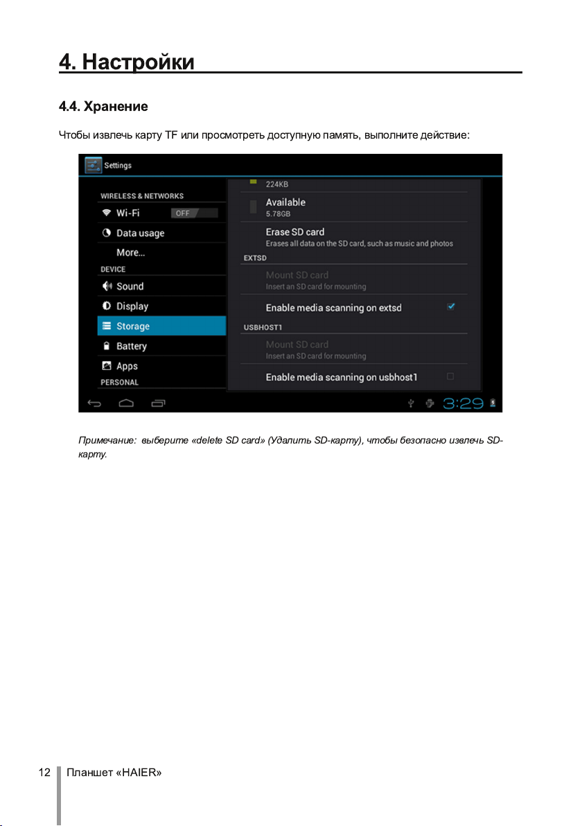 Чтобы извлечь карту TF или просмотреть доступную память, выполните действие: