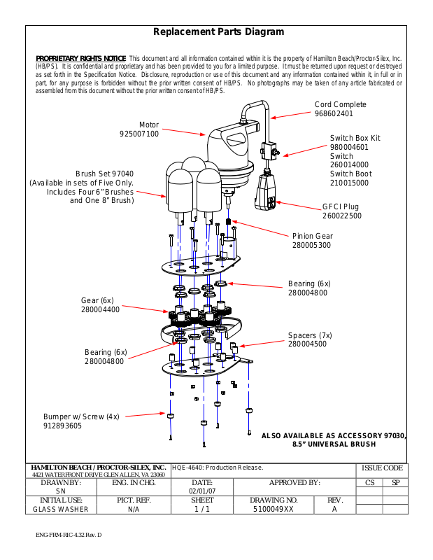 PROPRIETARY RIGHTS NOTICE This document and all information contained within it is the property of Hamilton Beach/Proctor-Silex, Inc.