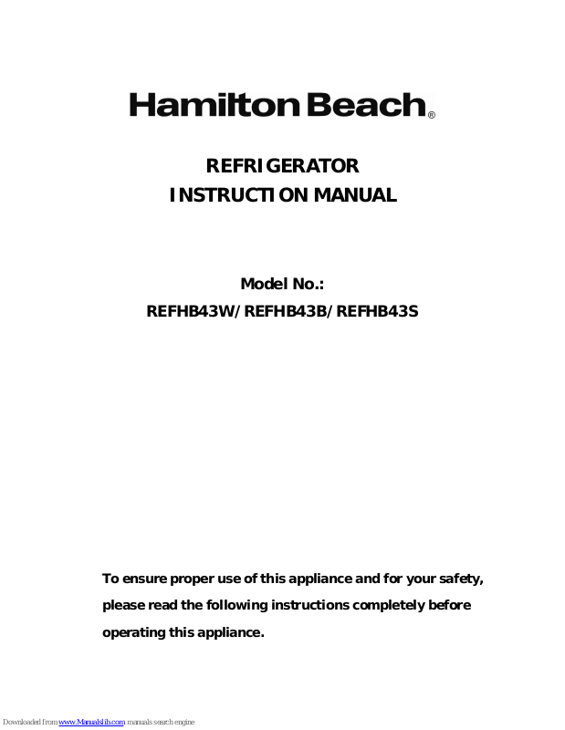 Refrigerator REFHB43W/REFHB43B/REFHB43S Use and Care Manual Support: 1-877-395-5109
