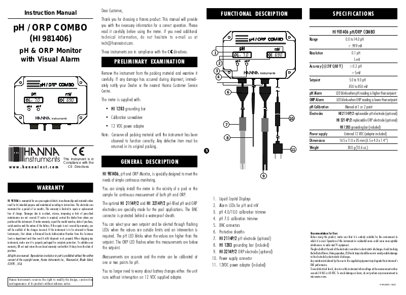 HI 981406 is warranted for one year against defects in workmanship and materials when