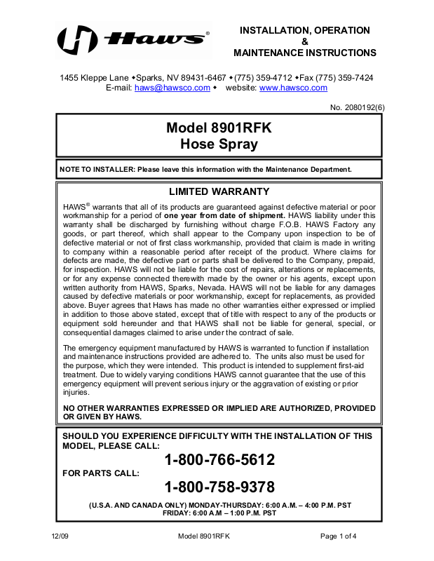 The emergency equipment manufactured by HAWS is warranted to function if installation